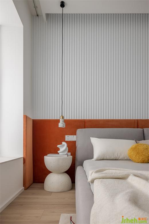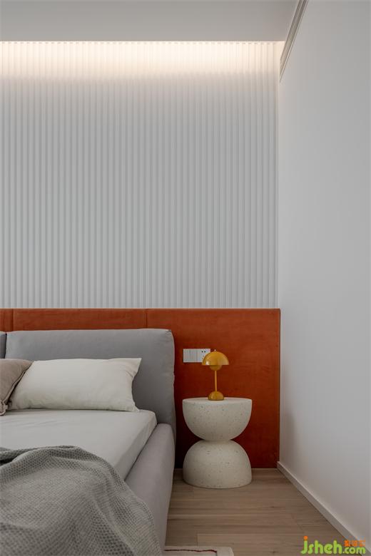 格柵元素結(jié)合色彩跳躍的橘黃色背景,在空間中成為整體視覺焦點,讓人眼前為之一亮;選用紗質(zhì)窗簾,恰如其分地為住宅引入自然光,在最大限度的保證隱私的同時,在光影的渲染下呈現(xiàn)出溫馨、舒適的質(zhì)感。