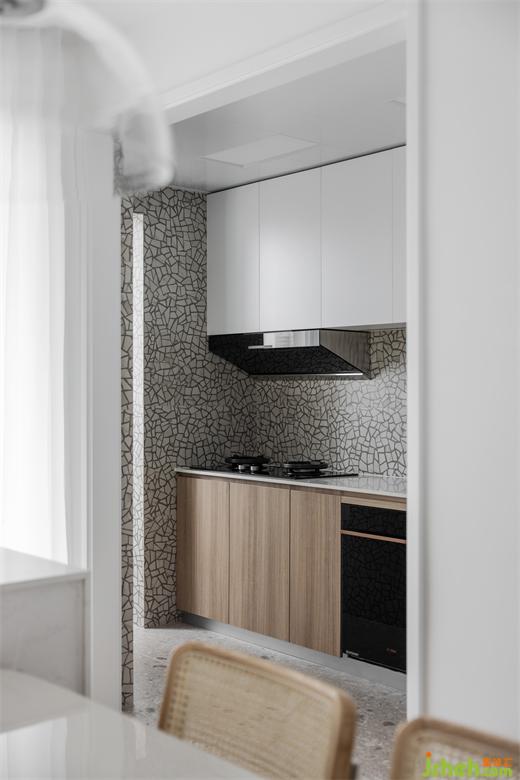 用不規(guī)則的瓷磚圖案設(shè)計廚房背景墻,美化了烹飪區(qū)墻壁的同時,其灰白跳躍的色彩也活躍了空間的氛圍。讓空間充滿活力和生機。