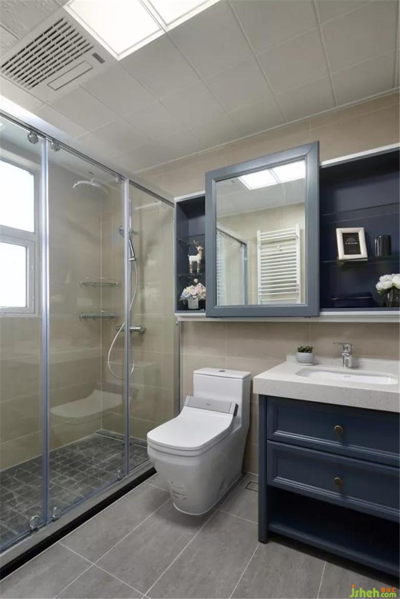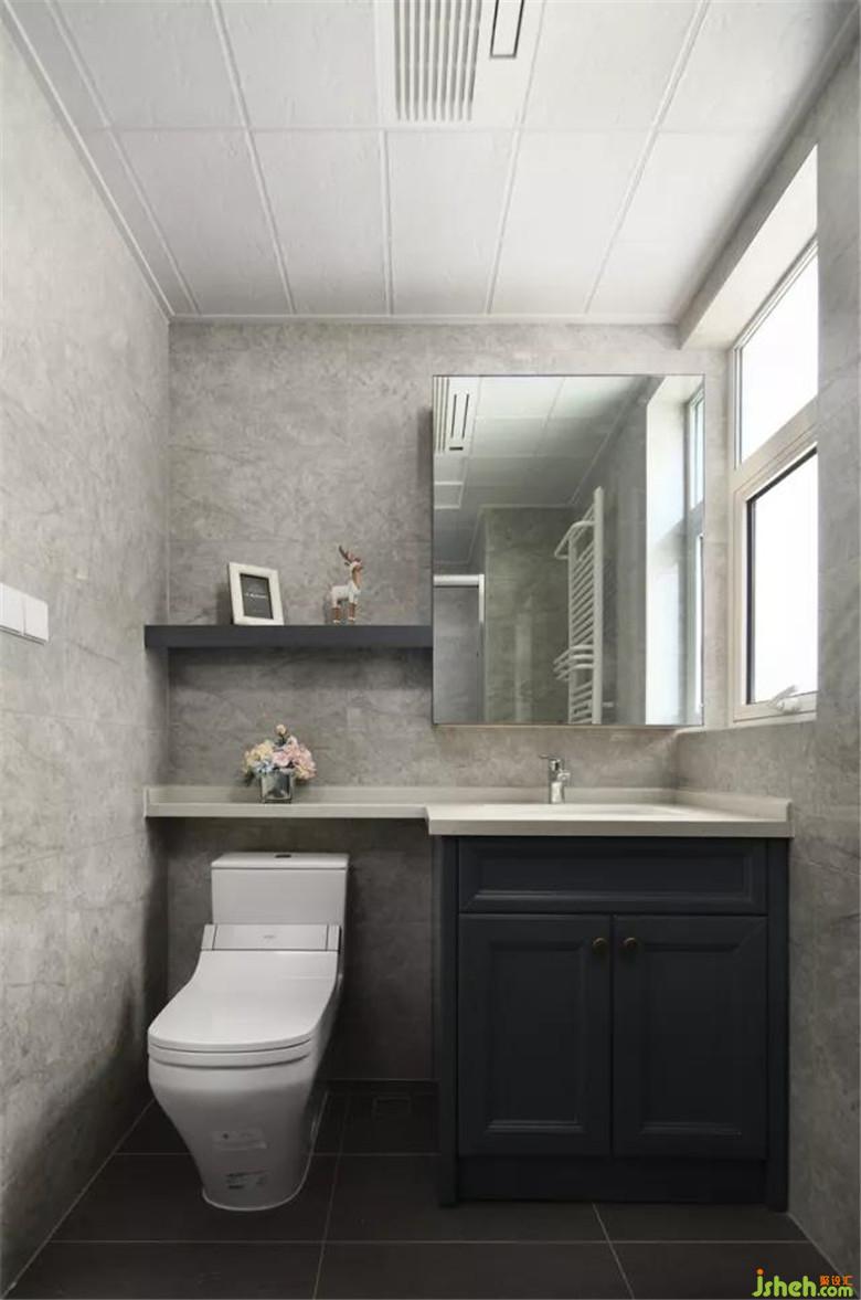 衛(wèi)生間設(shè)計了滑動鏡面柜門,壁掛式的鏡箱收納柜大大節(jié)省了空間。