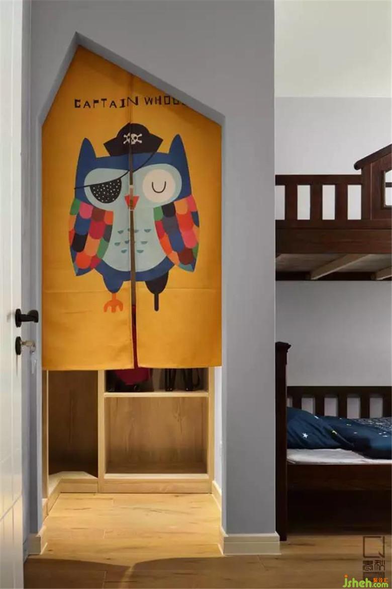 可愛的貓頭鷹,守護著兩個寶貝讓他們香甜入夢。上下鋪的設計不僅節(jié)省了空間,更具溫情。