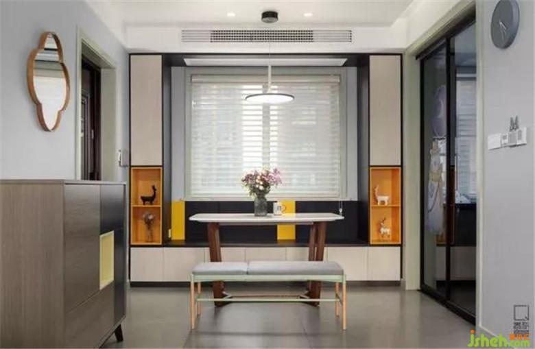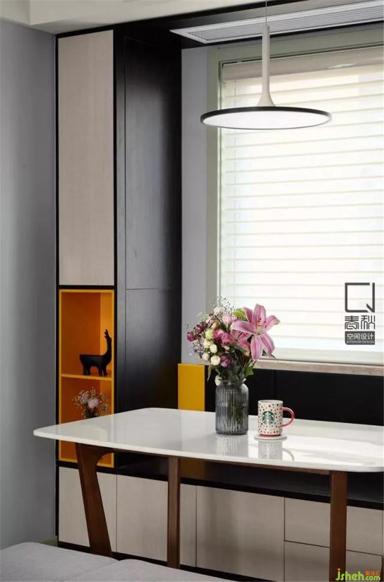 空間的局限阻止不了設(shè)計的想象,一桌一椅在設(shè)計師的世界里都是非常有考究的,一個加長凳,加深了空間的延展,布制工藝防止走動時的磕碰。兩旁的豎柜,即體現(xiàn)了對稱性的優(yōu)美,又起到了裝飾的效果。