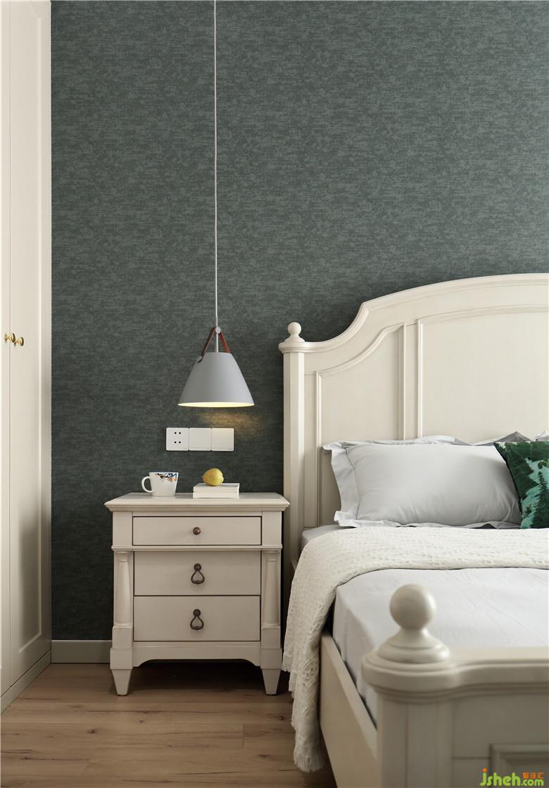 臥室墻紙室內(nèi)設(shè)計(jì)師選用了灰綠色,而家具則以白色銜接,并與地板的木色形成柔和的過(guò)渡,讓整個(gè)畫面融洽起來(lái),帶來(lái)一種經(jīng)歷生活洗禮的溫暖氛圍。