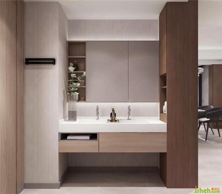 懸空式的衛(wèi)浴潔具,保證視覺上的寬闊感。嵌入式的收納設(shè)計,依照居住者的生活習(xí)慣,合理規(guī)劃,將空間極致利用,不動聲色地提升生活的品質(zhì)。
