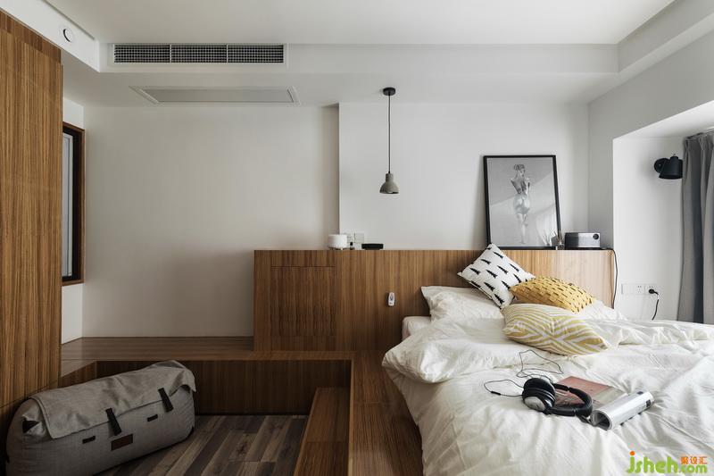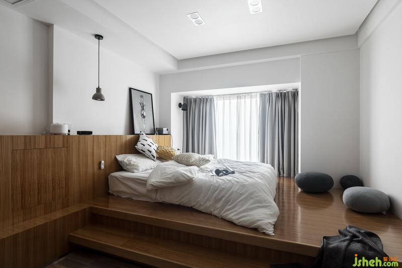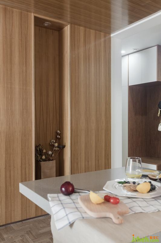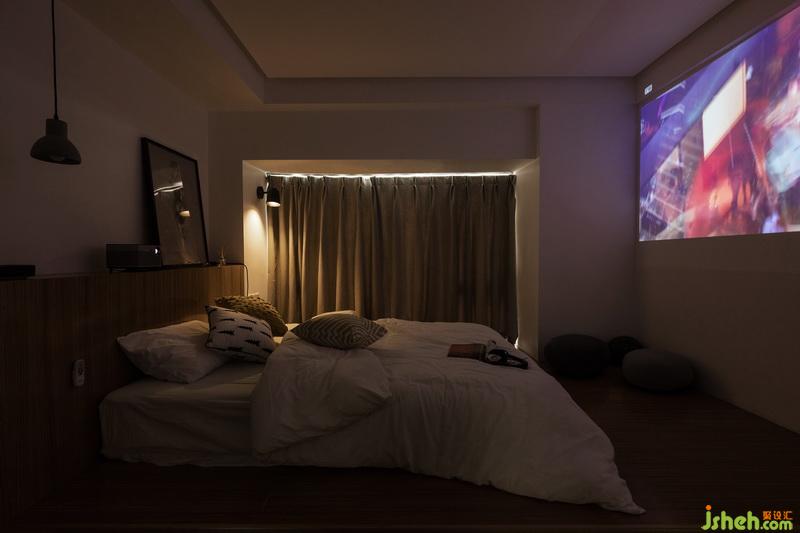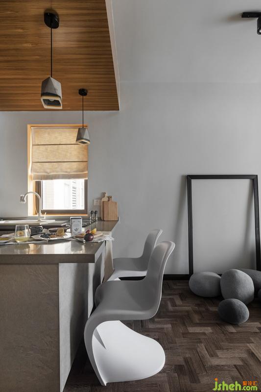 室內(nèi)設(shè)計師的設(shè)計從一開始就達成共識要取消掉客廳的概念;因為它會是運動場所+游戲場所+聚會場所+休憩看電視場所+曬太陽喝茶喝咖啡的場所,總之,它是有很多可能性的,所以這個空間并沒有基礎(chǔ)沙發(fā),采用地毯圍合懶人沙發(fā)+鵝卵石靠枕,隨意性的體現(xiàn)方便移動,收納,整合,待客……西廚忙碌的身影與吧臺等食的目光交織,白狐與翔貍的生活狀態(tài)里不需要餐桌,這是適合兩人空間的實用與舒適。