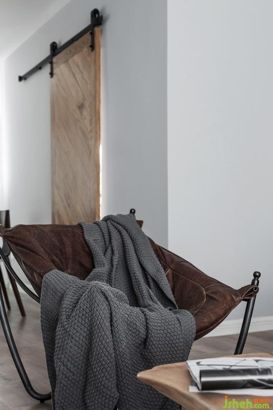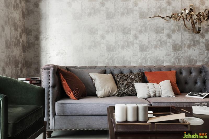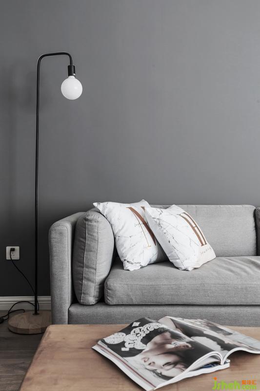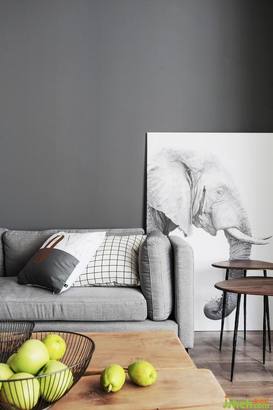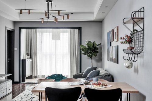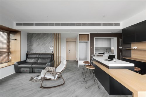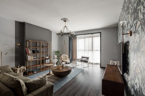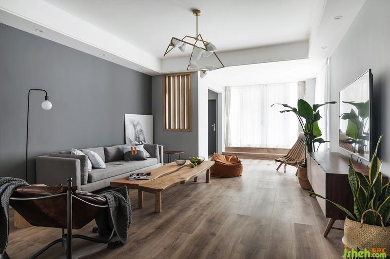 整體灰調,室內設計師用不同的材質及色調的灰色來做層次區(qū)分,沙發(fā)背景墻選用深灰,結合主沙發(fā)的淺灰,加深視覺上后退的圍合感,原木茶臺,油油綠植溫潤了整個空間。