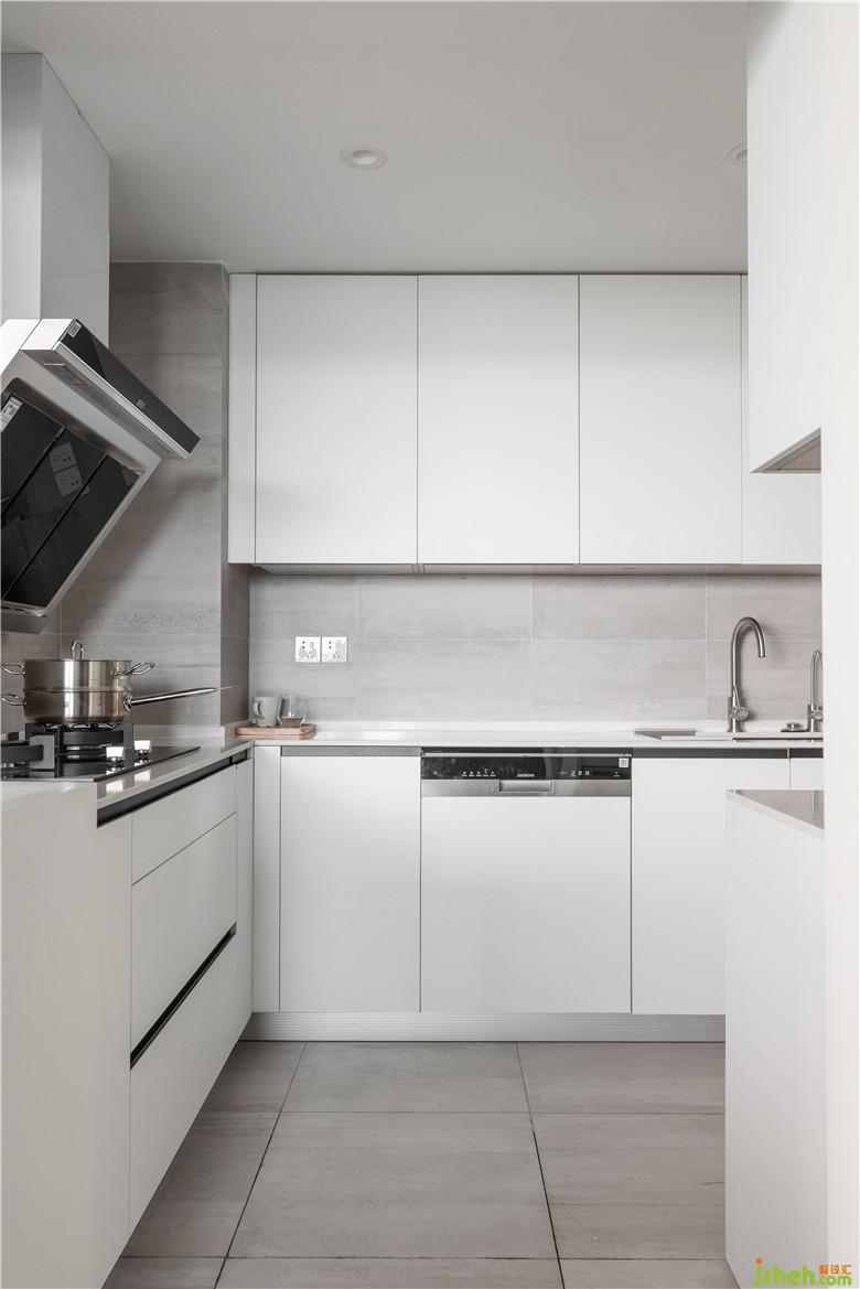 半開放式的廚房,室內(nèi)設(shè)計師以灰色底磚做為間色,輕柔的過渡到白色櫥柜,不張揚對立的意猶未盡;在某一方面來說,白色是缺乏色彩的,從而也是缺乏多樣性的表現(xiàn),它具有的純潔和虛無氣質(zhì)我們想盡數(shù)留給空間主人立體的交流,互動,陪伴來與之親近,演繹屬于他們的故事。