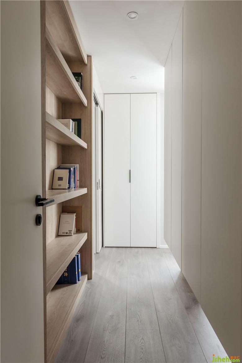 主臥進門右邊用干凈的純白免拉手觸碰門衣柜分隔出睡眠空間,不到1米的通道寬度,長2.5米,衣柜底部懸空處理將睡眠區(qū)好光線借過來一些,左邊將與衛(wèi)生間的共墻內(nèi)退32公分,改為木色開放書柜長1.5米,滿足喜愛閱讀的周先生與周太太豐富的藏書;這樣的操作,過道不小不悶也不黑,睡眠區(qū)域也有了足夠的私密性。