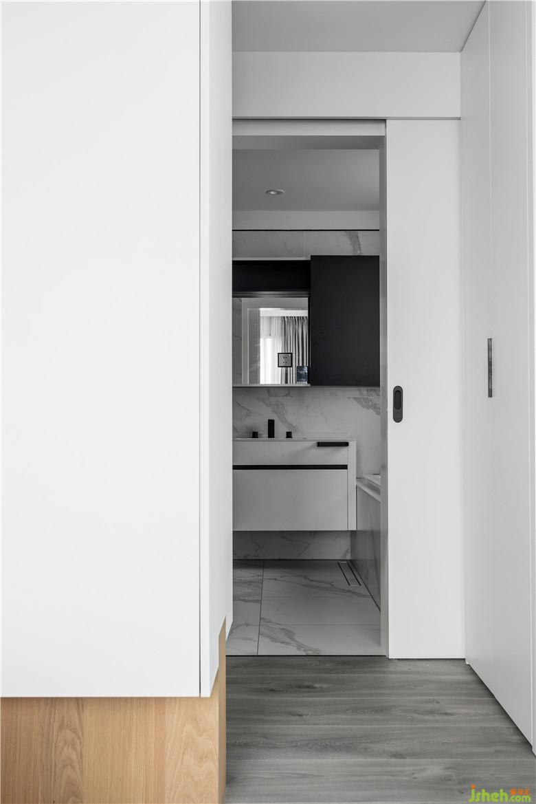 透過柔和的睡眠區(qū)走近主衛(wèi),一片純凈的黑白分明,鏡柜定制可推拉面板,滿足不同功能下的使用。