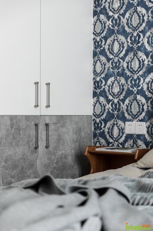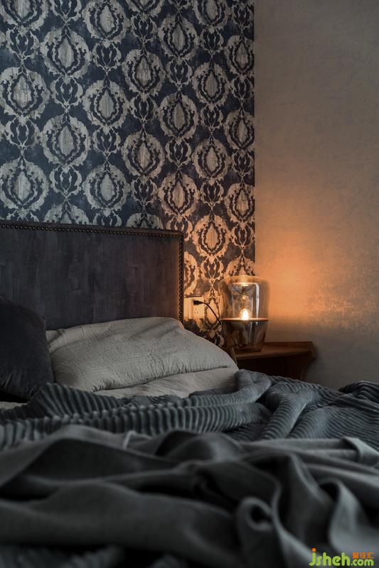 床頭燈溫馨十足,冷色壁紙與暖黃的光暈讓夜晚更謐靜與放松。