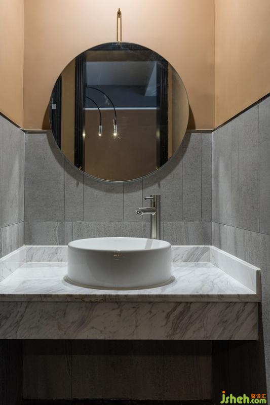 次衛(wèi)干區(qū)空間不大,一方面采用貼半墻磚的形式、另一方面涂刷和公區(qū)一致的太妃糖褐色,讓空間有延續(xù)感。