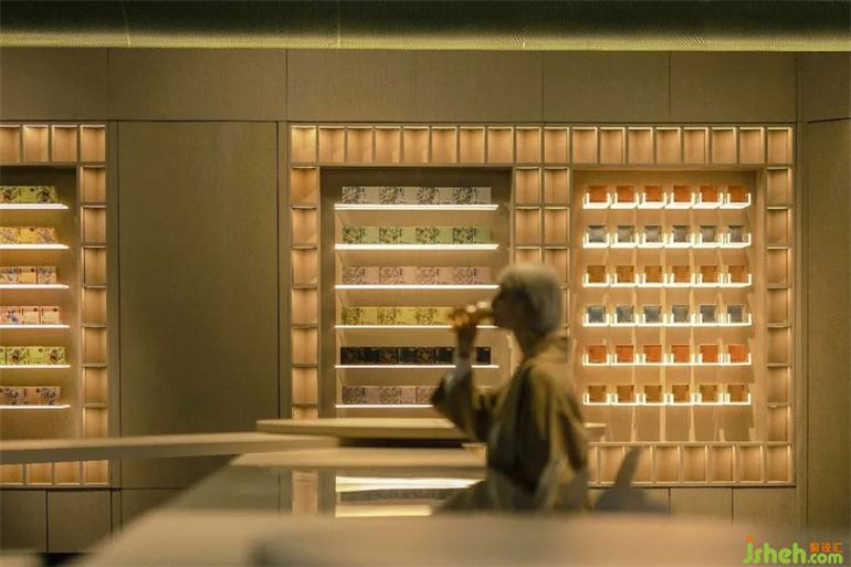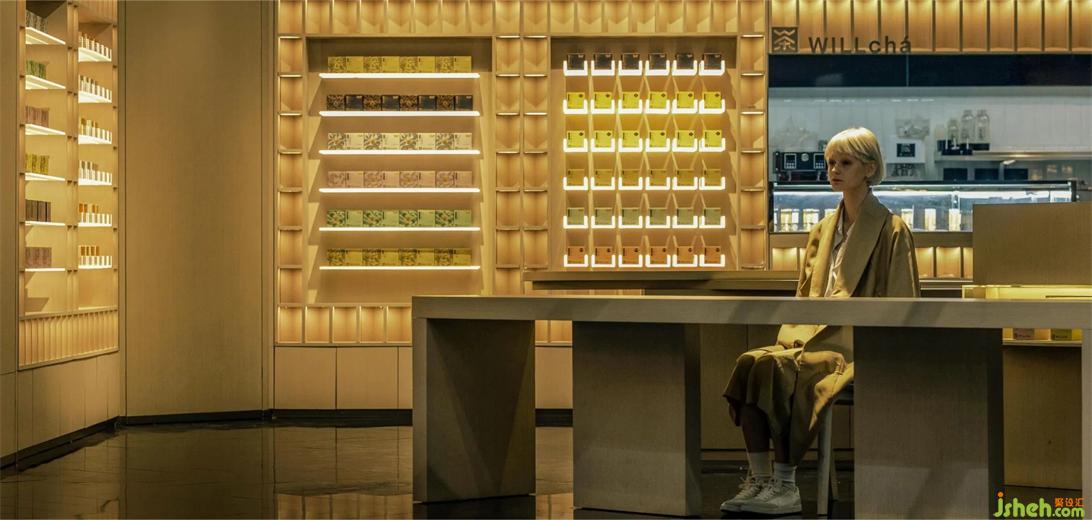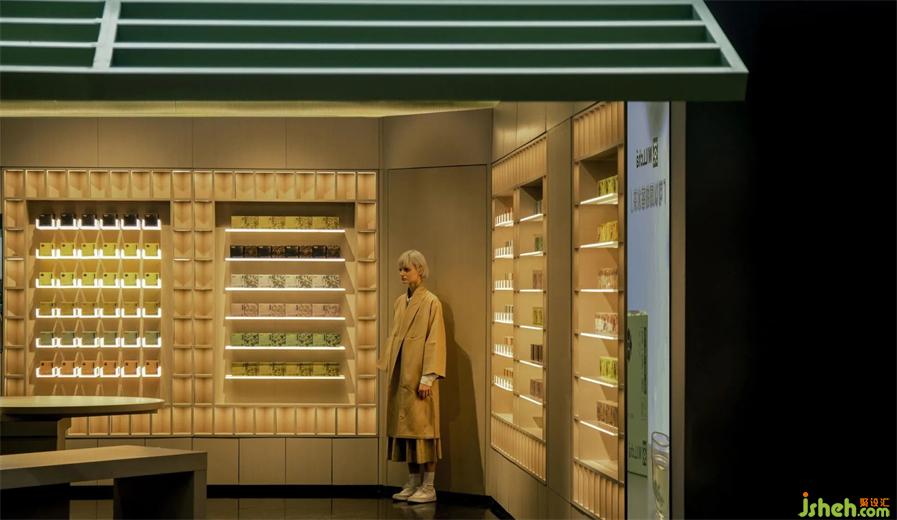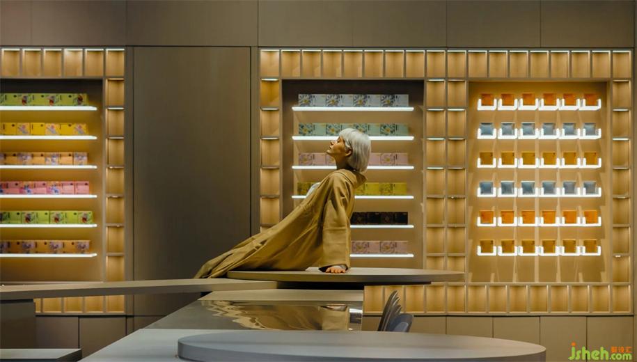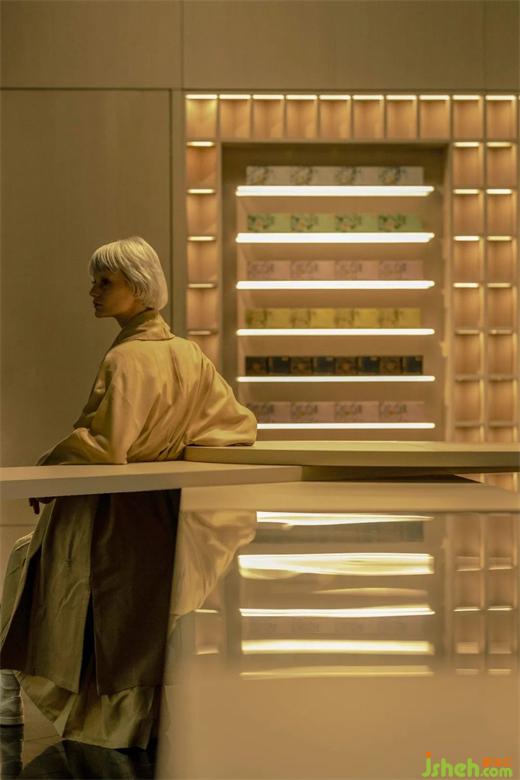 一回首,望見的又是另一幅電影場(chǎng)景般的畫面:天外來客般的女孩靜謐地坐在那兒,昂著頭顱閉著眼,旗艦店設(shè)計(jì)沐浴在微微泛黃的燈光下,繾綣訴說著整個(gè)空間的故事。