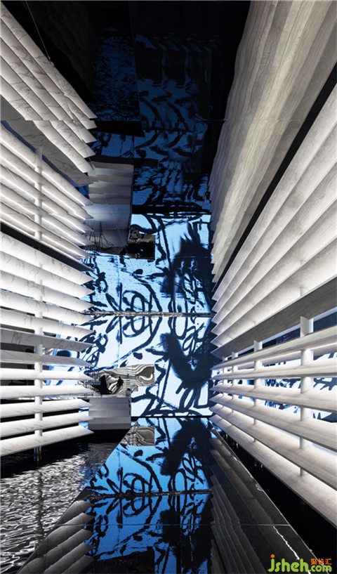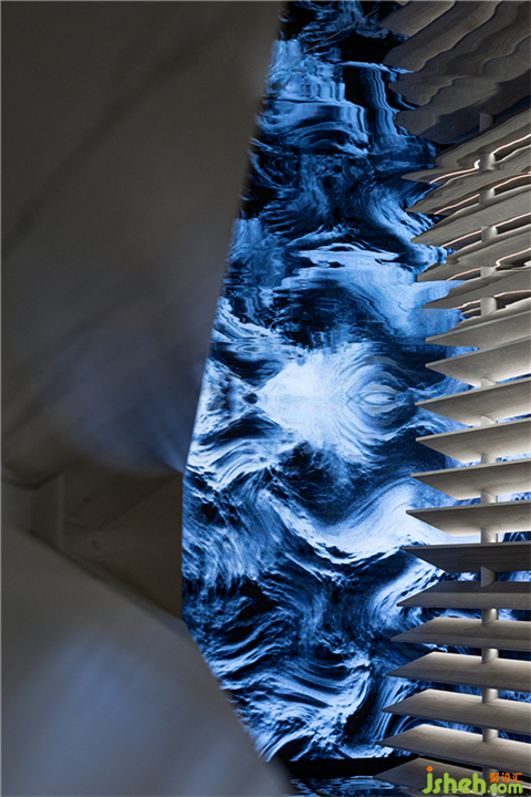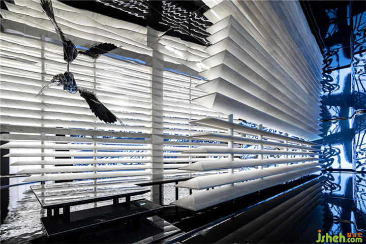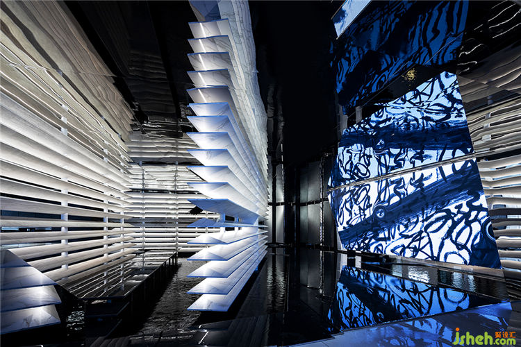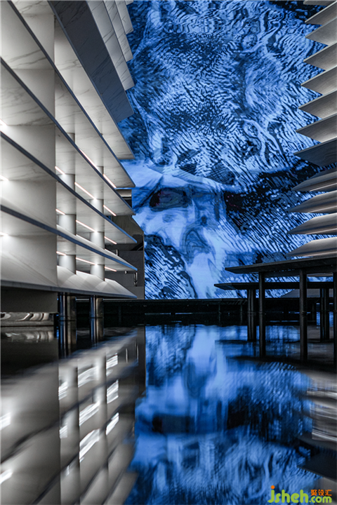 The ink-colored building stands still in the surrounding irregular mapping waterscape, and what makes people stop and watch is the freehand brushwork revealed from the wide windows: the layers of parallel lines are the background, the flexible water ripple texture is an ornament to space, and a long case is used to bring out the theme.