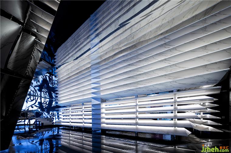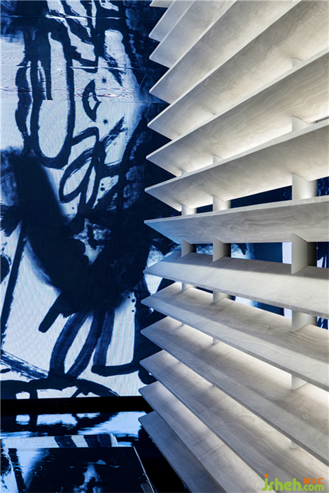 就像這個(gè)暗色調(diào)的空間,每每走入深處,展廳設(shè)計(jì)總會(huì)恍惚身在峽谷,那也是在隱喻源于石而優(yōu)于石”的概念。