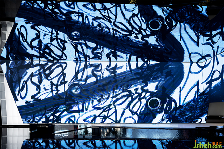 若停下腳步仰望,會(huì)看到空間中不規(guī)則出現(xiàn)的幾何體,它們或懸空、或倒置、或依附,時(shí)而反射水光粼粼,展廳設(shè)計(jì)時(shí)而映照線條變幻,像極了峽谷中的崖石,那是在大的雄渾中而清晰存在的小的精微。