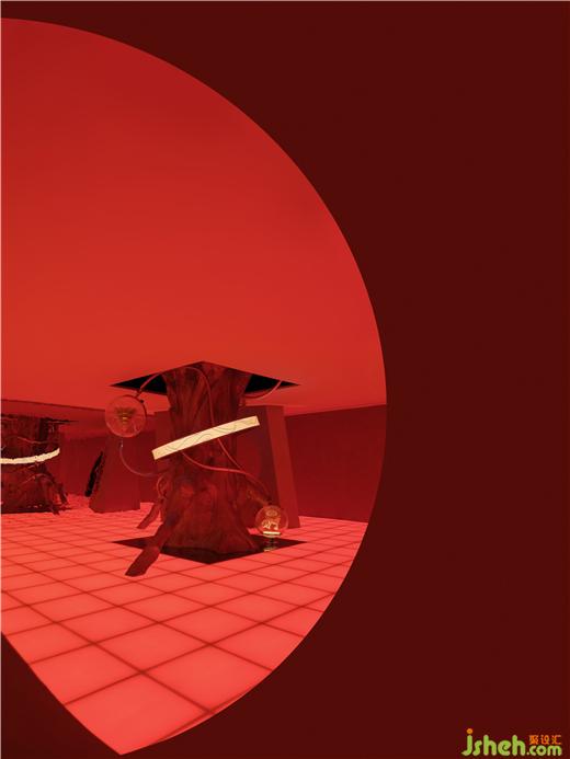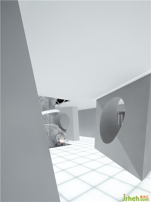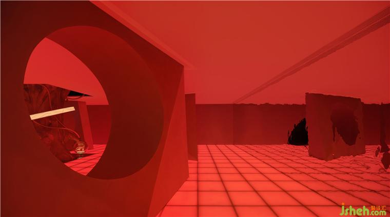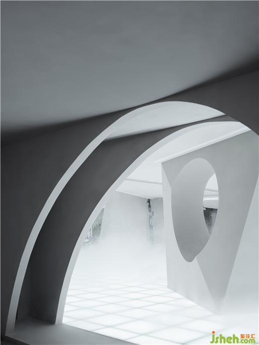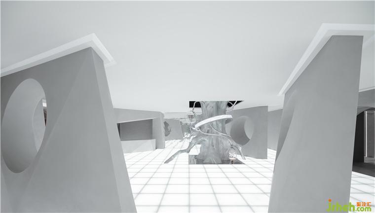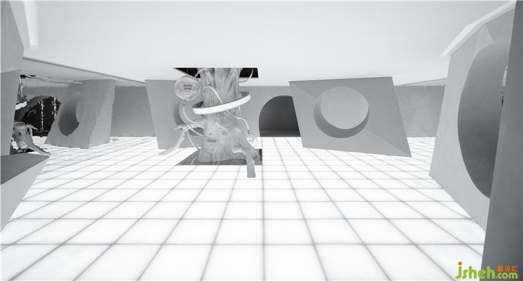 地板成為唯一主要光源,根據(jù)不同場(chǎng)景變化發(fā)出不同光效,光源透過(guò)鏤空的圓孔,美術(shù)館設(shè)計(jì)整個(gè)結(jié)構(gòu)框架的脈絡(luò)清晰可見(jiàn),線性線條的利落美呼之欲出,讓玩家在交錯(cuò)、穿插、重疊的視覺(jué)空間感受現(xiàn)實(shí)與虛幻的輪回與碰撞。