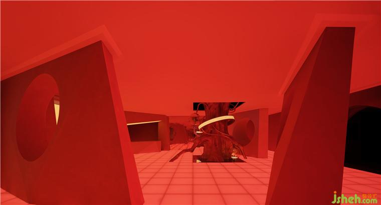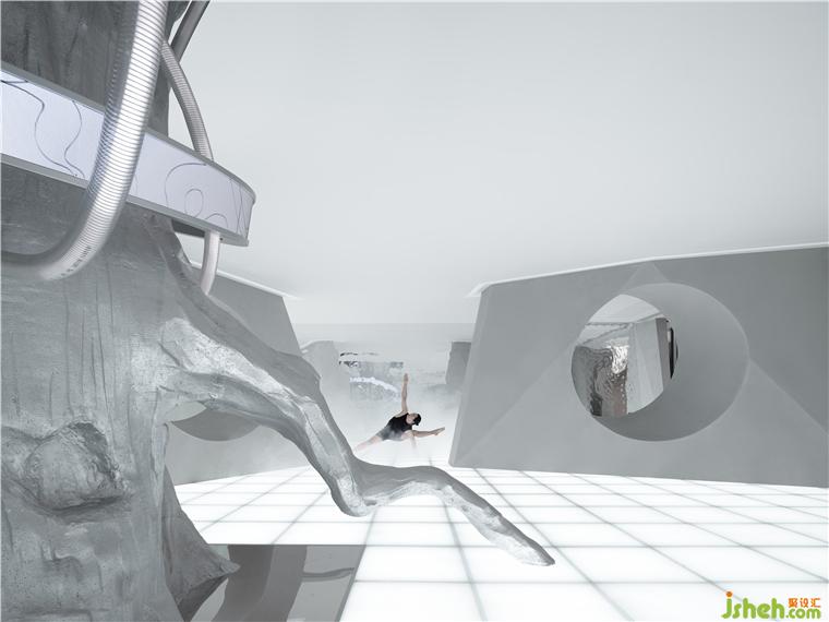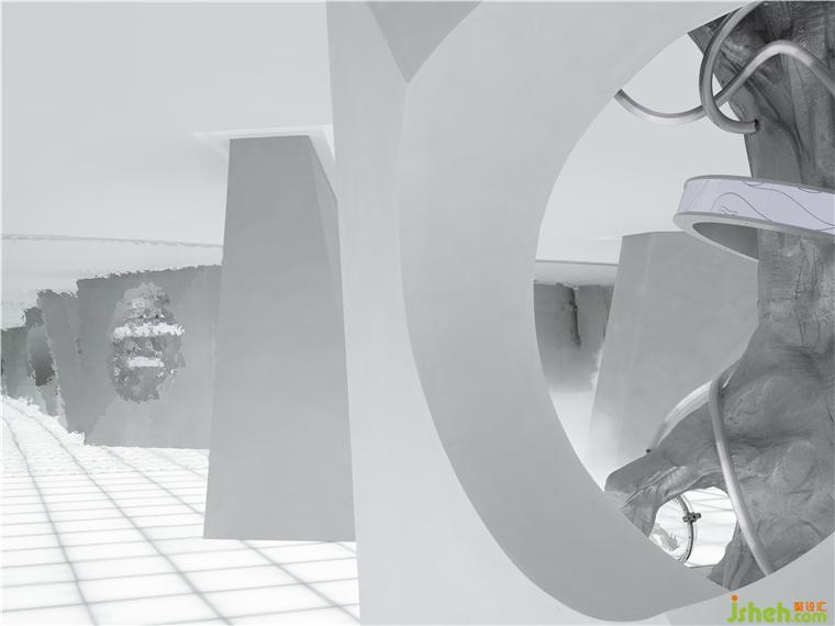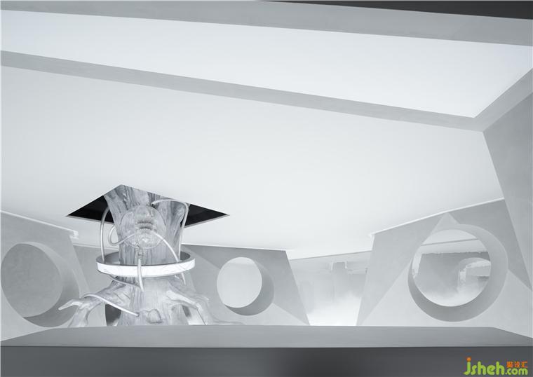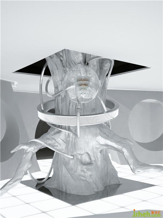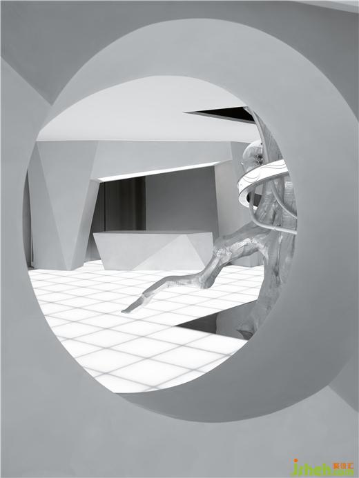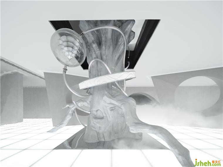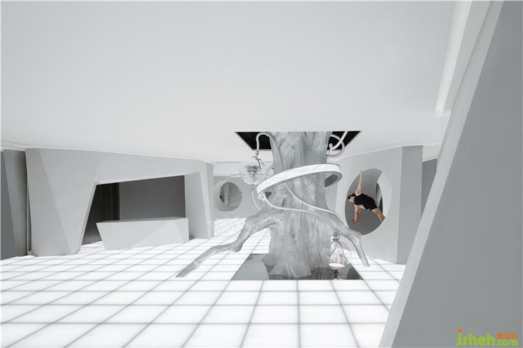 驚喜與意外觀感也隨之而來,一棵穿過天花板的大樹,它究竟要通往何處——或許是另一個(gè)平行世界,總是引人無限遐想。美術(shù)館設(shè)計(jì)未來感造型環(huán)繞在樹周圍,自然與科技的結(jié)合尤為驚艷,猶似蔓藤與走獸的燈飾裝置纏繞而上,抽象的藝術(shù)概念效果即刻達(dá)成。