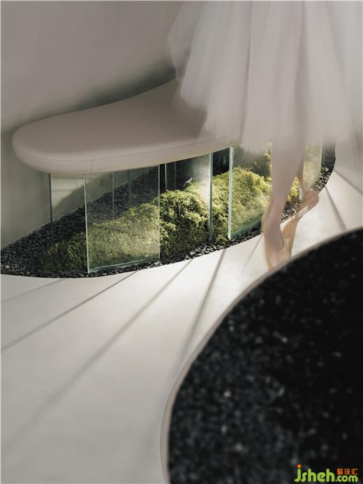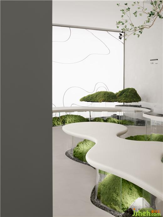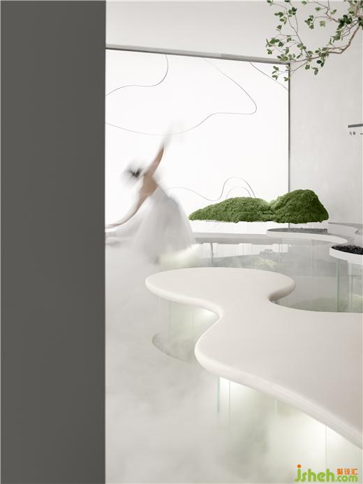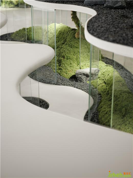 美術(shù)館設(shè)計以沙丘為設(shè)計靈感的座椅搭配透明亞克力材質(zhì)創(chuàng)造懸浮之效果,其走勢則蜿蜒流動,猶如無形之風(fēng)拂過而留下的痕跡。青綠苔蘚向陽生長,自然的起伏形態(tài)為空間納入更多活力,與搖曳的竹影相映成趣,生機(jī)盎然,清新和煦,令人置身其中也無比輕盈愉悅。