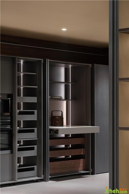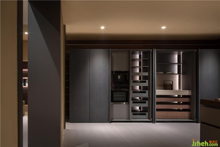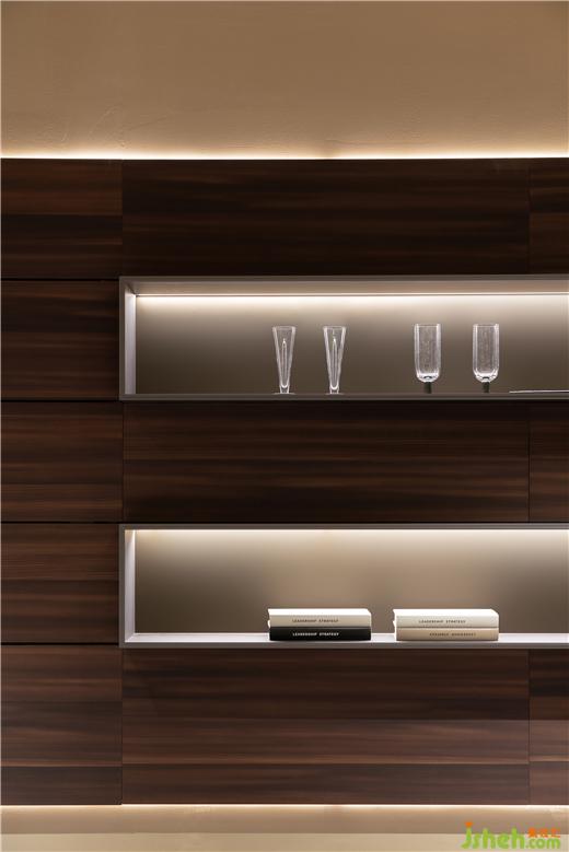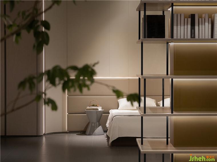 入內(nèi),多元的品質(zhì)化生活場(chǎng)景徐徐展開,光影流轉(zhuǎn),移步換景,衣柜、博古柜、隱形門,墻板展示等與空間進(jìn)行有效融合,細(xì)節(jié)質(zhì)感考究。全屋定制展廳設(shè)計(jì)通天書柜尤為出彩,即為隔斷,在藏與露之間營(yíng)造多層次的透視關(guān)系,又在視覺上與弧線寰宇框架成交錯(cuò)狀態(tài),提供豐富的線條變化。