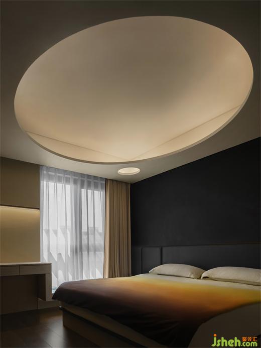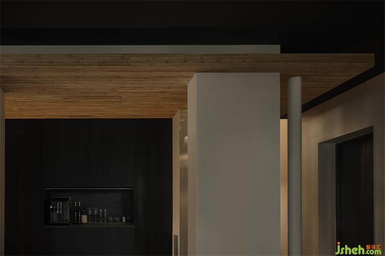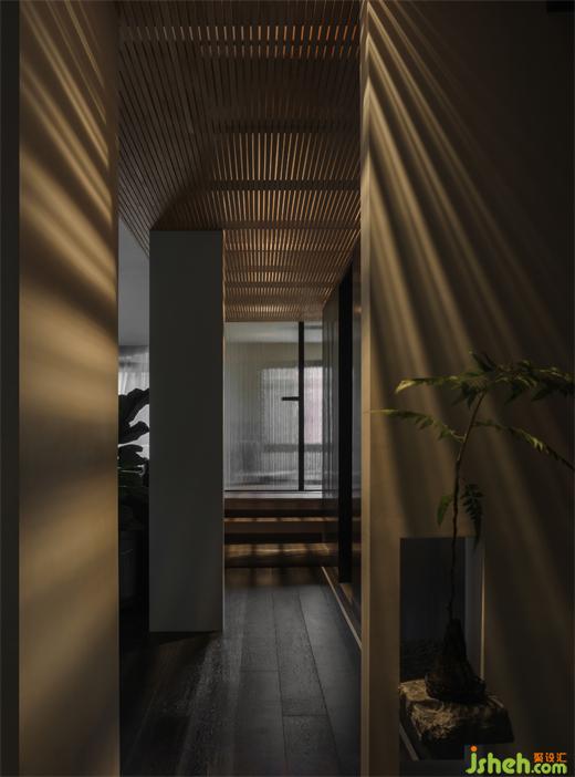 玄關(guān)頂部以細(xì)竹排列為吊頂,刻意制造出體量感仿佛穿插搭接在客廳的墻面之上,加強(qiáng)了兩個(gè)區(qū)域的關(guān)聯(lián),而也與清透的材質(zhì)之間形成了微妙的平衡,燈光從頂上打下,別墅設(shè)計(jì)在玄關(guān)處留下曖昧的明暗陰影。