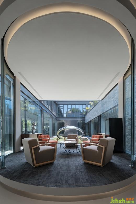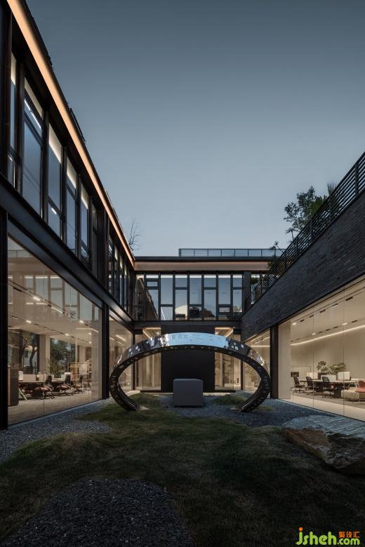 建筑中嵌套了一個內院,內院的大玻璃結構設計將自然的天光引入室內,圍繞內院形成了內部的一個洄游動線。