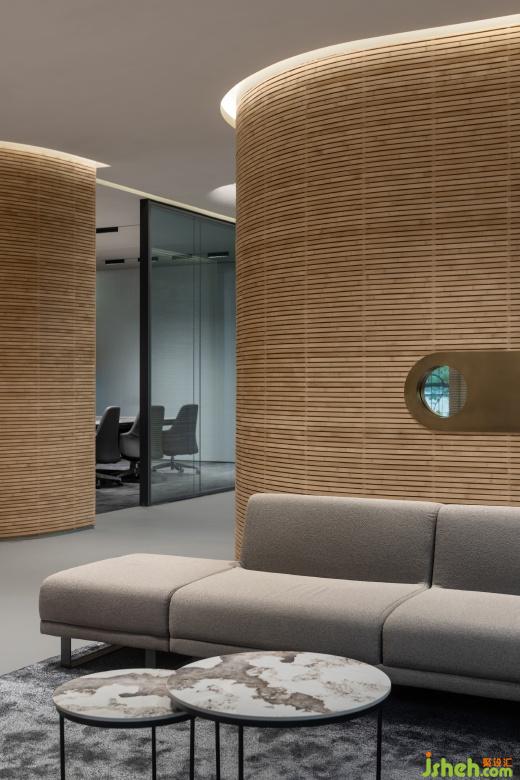 不需要實體的隔墻,僅依靠形態(tài)各異的家居組合就在將開放空間內(nèi)構(gòu)建出不同的規(guī)模不同形式的交流洽談活動,配合兩邊的落地窗,顯得空間更加通透與靈動。