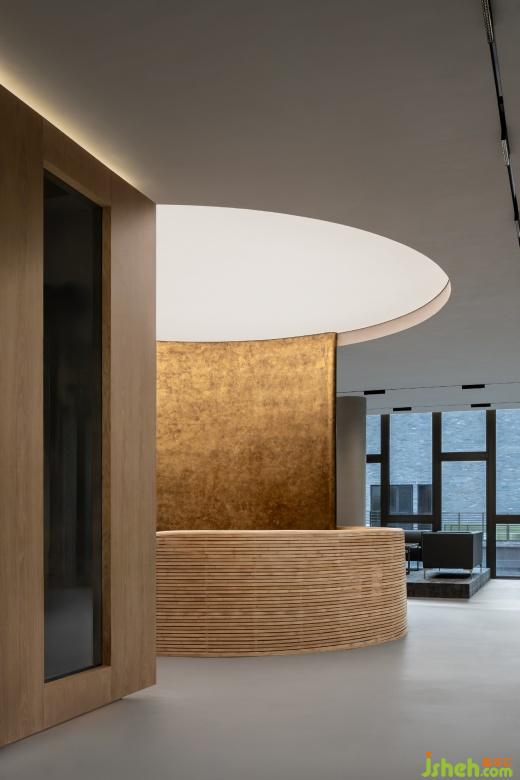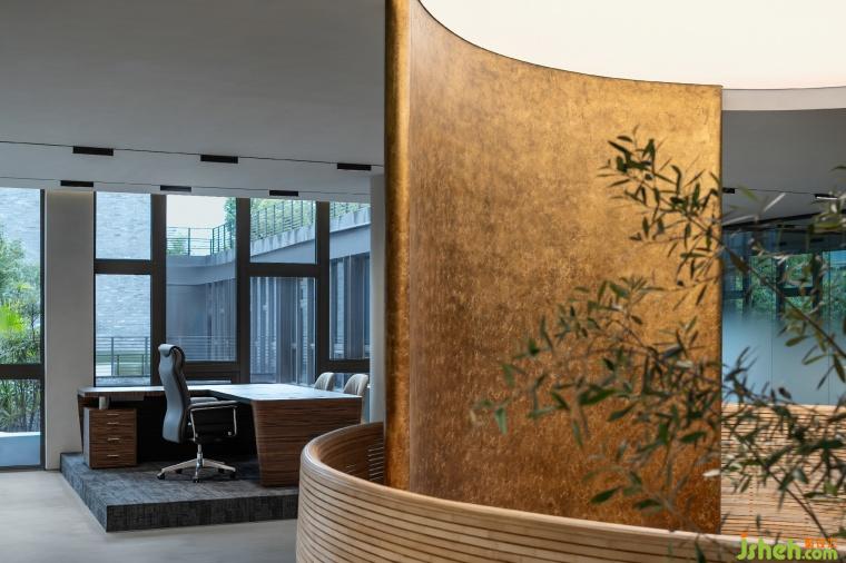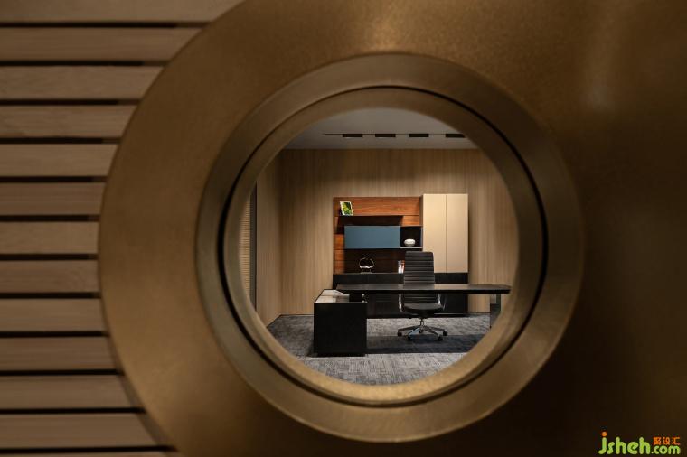 懸挑出的端頭布置的辦公室兼具了辦公與中型會議功能,屋內(nèi)的灰鏡吊頂放大了空間縱向上的高度,現(xiàn)代感的材料也為空間賦予了幾分冷冽的權(quán)威之感。