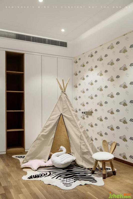 兒童房,我們拒絕低齡化設(shè)計,所以整體色彩搭配會綜合考慮BABY未來十年的成長過程??紤]到當(dāng)前業(yè)主的BABY年齡還小,所以設(shè)置了具備游戲性的小帳篷,未來BABY長大了,這個空間可以很輕易的添置1.8M尺寸的床。