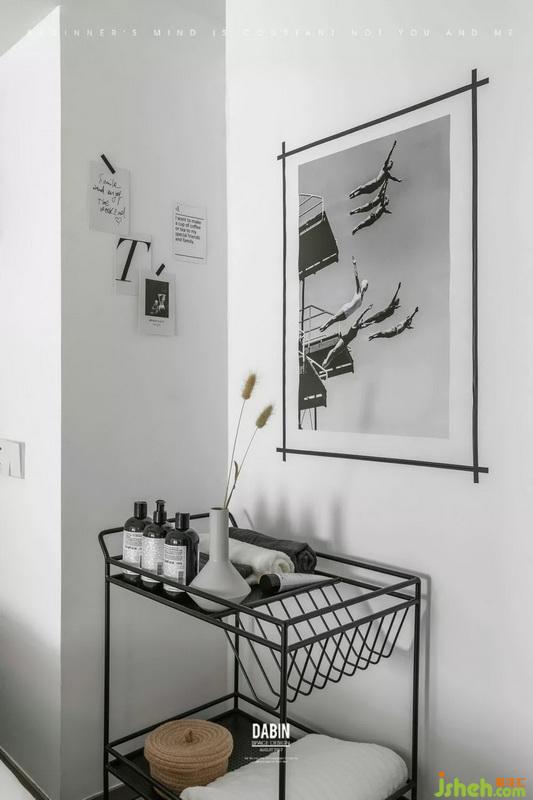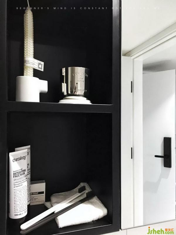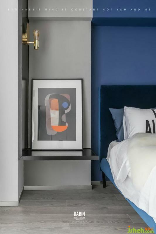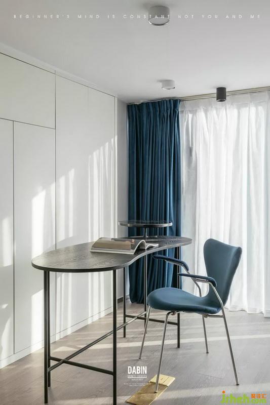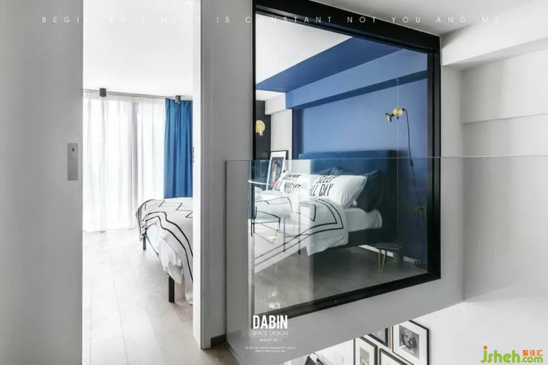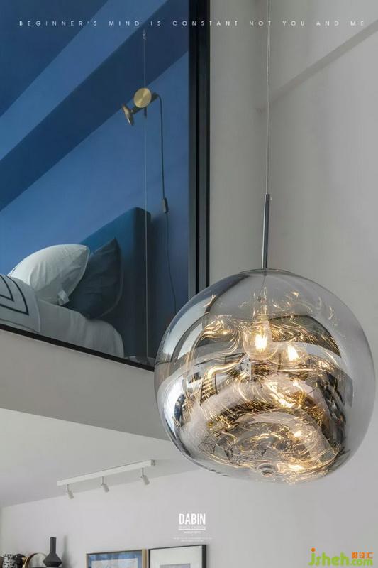 懸空的黑色樓梯,在整個房間的中點,似是盤旋而上,通透的玻璃讓視線自由穿越。pleasewait to be seated的壁燈與墻面藍色相互呼應(yīng),圓與方的碰撞,不止樓梯,也在客廳,也在臥室。 設(shè)計公司