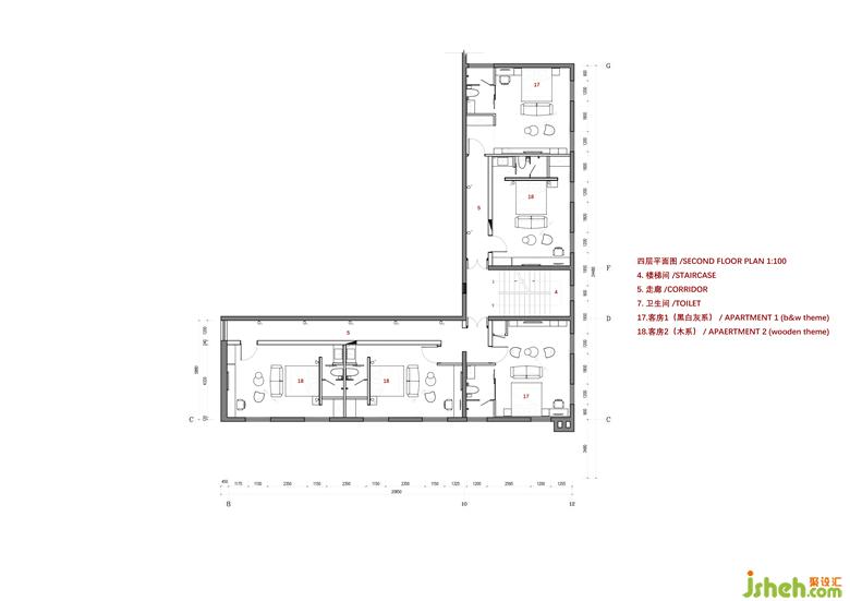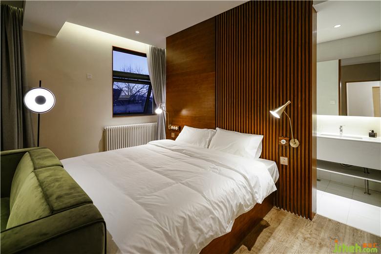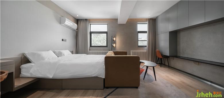 共享際的四層是以公寓為主的功能,在共享際這樣的一個空間內(nèi),可以滿足人們工作、休閑、居住、生活、文娛等各方面的需求。為了給租客提供更多樣化的選擇,我們設(shè)計了兩種客房,除了風(fēng)格色調(diào)的差異,材質(zhì)與軟裝的搭配也略顯不同。