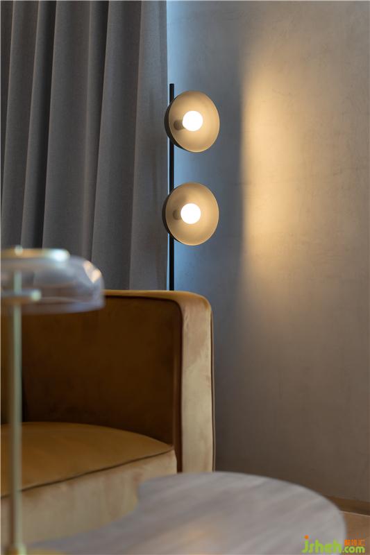 In the wood color apartment, the background wall of the bedroom adopts the combination of walnut wood panel, taking into account the function of the headboard at the same time. The combination of distressed metal wall lamps and retro switch panels makes the details of the space more exquisite. The open use of the bathroom and cloakroom is comfortable and flexible so that tenants can experience the theater elements contained in the space in detail.