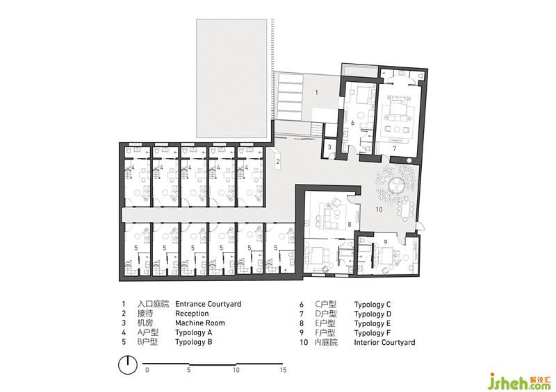 場地中原有的三組建筑物分別為東南側(cè)三間平頂磚混庫房、西側(cè)兩排坡屋頂磚木混合結(jié)構(gòu)廢棄建筑、以及天橋底部兩層的宿舍樓。大觀建筑在改造設(shè)計中既要使得獨(dú)立分散并且保存狀態(tài)各不相同的三組建筑物有序的共存,又能因地制宜的設(shè)計出不同的客房風(fēng)格展示不同的非遺文化。