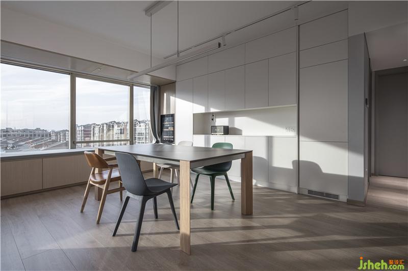 The window on one side of the living room is the biggest highlight of the apartment. We made a window on the whole side with a cabinet, turning the original single daylighting window into the form of a bay window. It forms a transitional and interactive space with the scenery outside the window and the dining and living room inside the house, which not only satisfies the storage function but also allows the owner to sit on the bay window and enjoy the scenery outside the window. The drawer under the bay window is also a very practical storage space, which can store more than 100 pairs of shoes of the host and hostess.