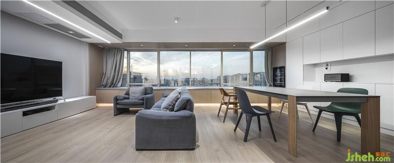 客廳一整面的窗戶是整個公寓最大的亮點,我們用柜子做成了一整面的窗臺,使原本單一的采光窗變成了飄窗的形式。與窗外風(fēng)景以及屋內(nèi)的餐客廳形成了一個過渡和互動的空間,既滿足了收納功能也能讓業(yè)主坐在飄窗臺上欣賞窗外的美景。飄窗下的抽屜也是一個非常實用的儲藏空間,可以收納男女主人的100多雙鞋北京裝修設(shè)計。