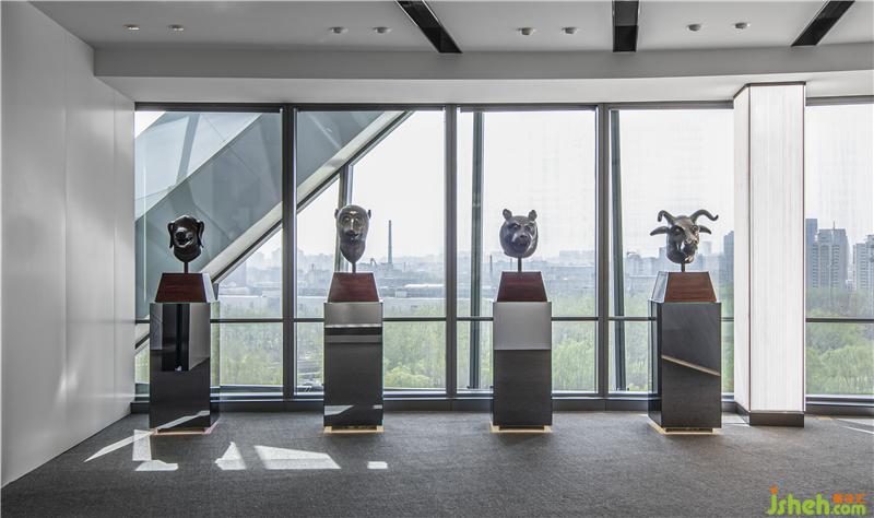 From the light curtain into the front area, the whole space presents a simple and gray sense. In addition to the necessary reception functions of the reception area, a group of display areas are also set up here. In May 2000, Poly Group rescued the three National Treasures of the Old Summer Palace-Bull Head, Monkey Head and Tiger Head-bronze statues that were plundered by foreign powers more than 100 years ago, and returned to China, which aroused widespread acclaim at home and abroad and inspired the patriotic enthusiasm of Chinese. On the side of the reception area, there are four bronze beast heads from the Old Summer Palace collected by Poly Group. These artistic treasures are also a symbol of the light of national culture.