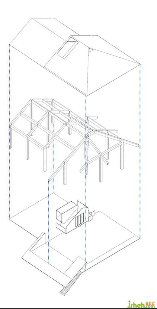 原來(lái)是大斜坡的屋頂,如果按照原來(lái)的形狀效果,屋頂勢(shì)必被平面化,也不能與內(nèi)部空間有機(jī)結(jié)合,我們以退為進(jìn)在屋頂向外挑出一個(gè)白色盒子,尖形的屋頂體量被削去了一角,是二樓夾層向外的延伸,延長(zhǎng)了內(nèi)部空間的長(zhǎng)度,酒吧餐廳設(shè)計(jì)打破沉悶厚重的尖形屋頂。麻雀雖小五臟俱全,小盒子的內(nèi)部是私密包廂空間,圍繞盒子構(gòu)造布置家具,向酒館內(nèi)側(cè)開長(zhǎng)條格柵窗,站在小型階梯可以頂部眺望遠(yuǎn)方。
