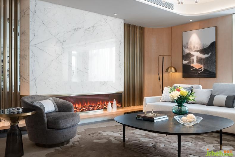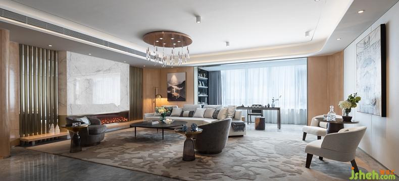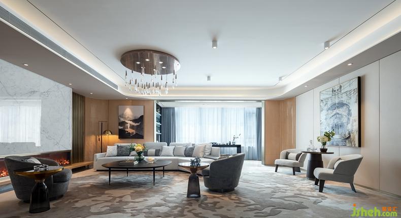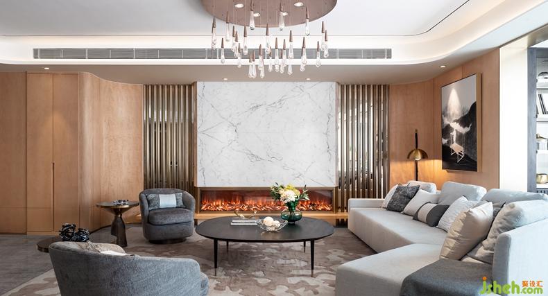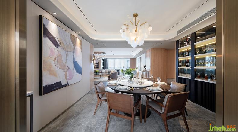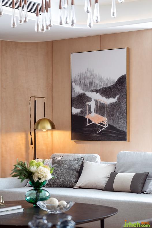設(shè)計將陽臺改建為多功能區(qū),兼具品茶區(qū)與書畫區(qū)功能,大落地窗給客廳帶來更多的觀景視野。電視背景墻用魚肚白云石鋪設(shè),遠望去,石材紋理竟渾然自成一幅飛鳥圖,地毯好似光照映射下的斑駁樹蔭,與掛畫的抽象山形互相交融,勾勒出“山氣日夕佳,飛鳥相與還”的意境。另一側(cè)劃分出一處小洽談區(qū),恰到好處的留白盡顯空靈的東方韻味,虛實相生皆成妙景。