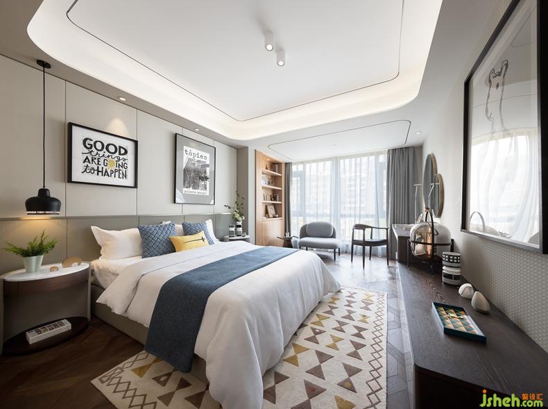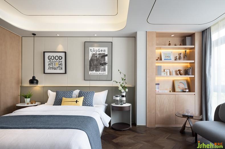 長輩房以灰色為基調(diào),與木色相配,材質(zhì)轉(zhuǎn)換與色彩變化平緩而自然過渡,端正穩(wěn)重,井然有序。男孩房用略微明亮卻