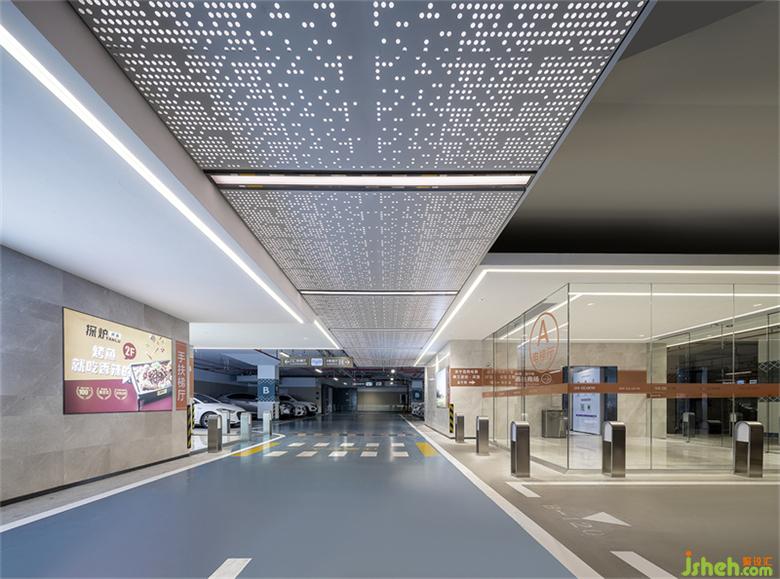 地下空間以白色、米色為主色調,弱化層高的壓抑感,提升空間的通透性與明亮度。天花造型以網狀幾何體塊拼接,為視線留出更多通透空間的同時,用不同的藝術形態(tài)差別化的提升整體空間的趣味性。