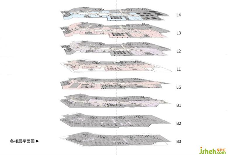 商業(yè)及商業(yè)配套分布于B1-L4層,共設(shè)置約2500個停車位,且每層均設(shè)有停車場,可直達(dá)各樓層。人流動線設(shè)計呈水波流動形態(tài),商場設(shè)計與天面、檐口等設(shè)計元素統(tǒng)一呼應(yīng),并在B1、L1、L2層通過頭尾兩處與B區(qū)、D區(qū)連通。