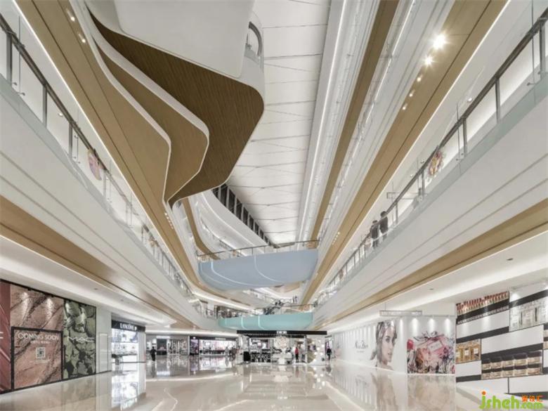 室內(nèi)空間以海浪、礁石為設(shè)計靈感,融合整體建筑曲線,營造出流動的力量感。商場設(shè)計石材的硬質(zhì)與木飾面層疊出海浪的蜿蜒涌動,兩種材質(zhì)剛?cè)岵?jì)的碰撞穿插,創(chuàng)造出空間的層次與深度,展現(xiàn)生生不息的靈動之美。