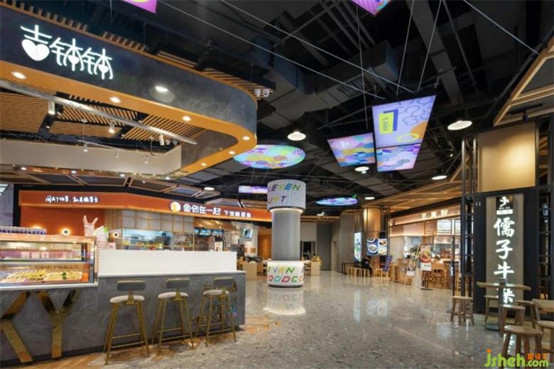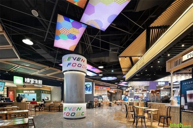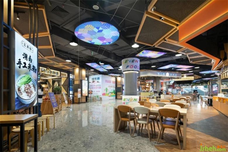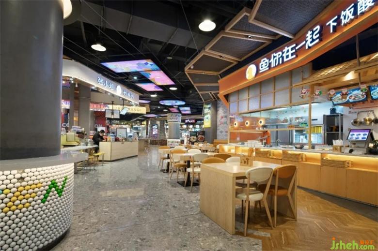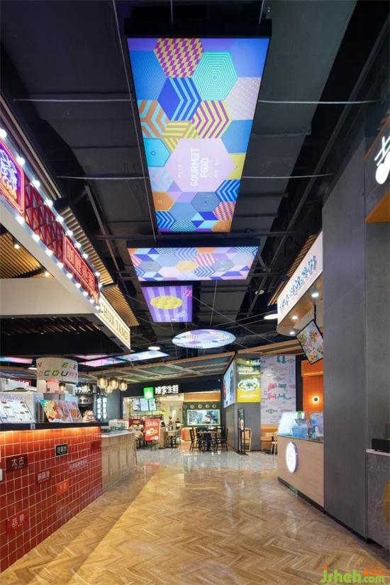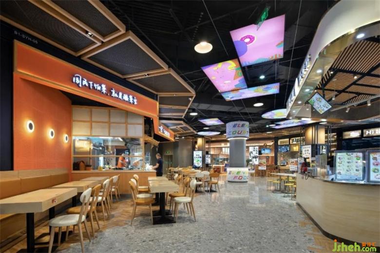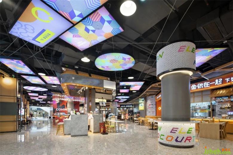入口處由很多個(gè)不同顏色的高爾夫球組成的標(biāo)志性的大臺(tái)燈,散發(fā)出溫暖的光,美食廣場(chǎng)設(shè)計(jì)將大家?guī)胼p松愉悅的空間,從而開始美食之旅。