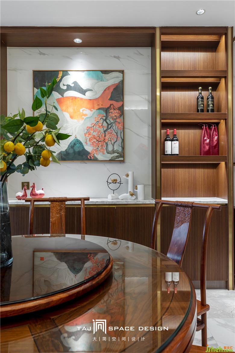 有“味道”的新中式餐廳,以當(dāng)代手法演繹,注重實用的實用性,并將人文情懷注入平常生活。餐廳的空間室內(nèi)設(shè)計師以圓桌為中心將周遭輻射成一個圓形環(huán)繞動線,使得餐廳更加富有創(chuàng)意而不呆板,厚重實木的餐桌則體現(xiàn)了中式的大氣沉穩(wěn),與客廳的意境相得益彰。