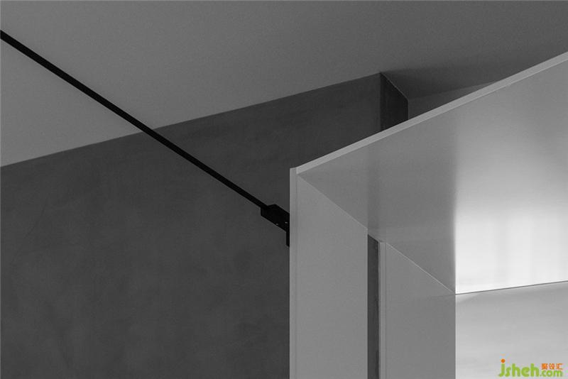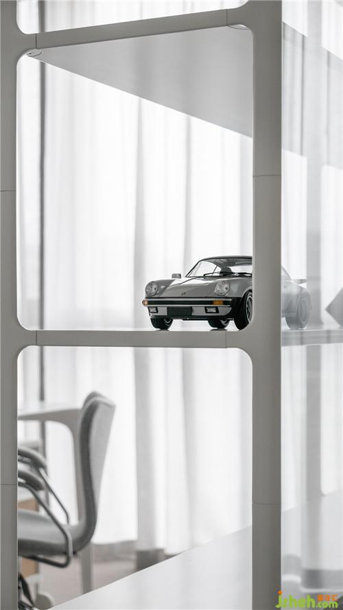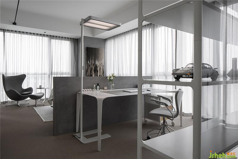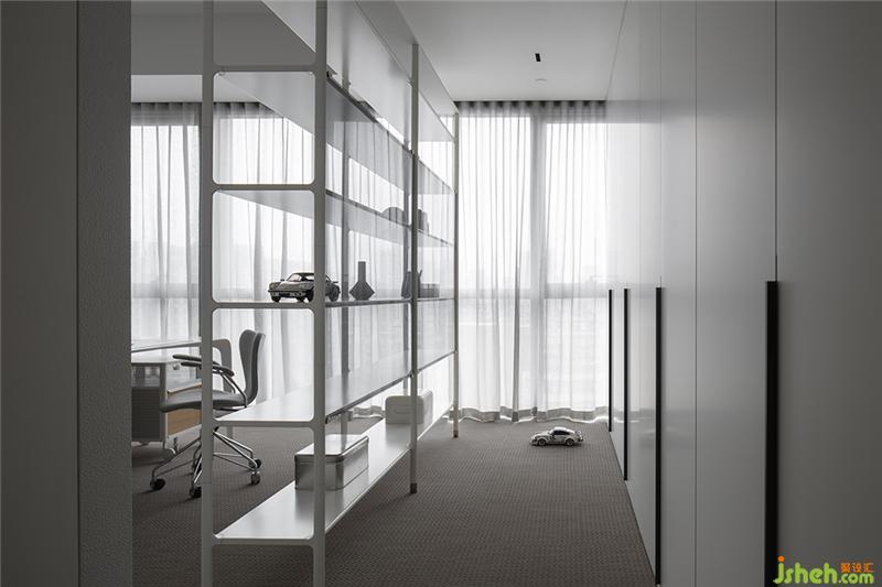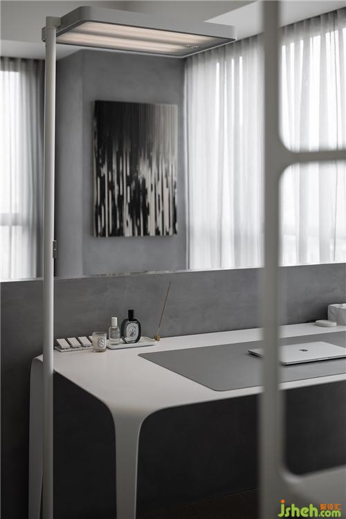 白色鏤空置物架保持空間通透感的同時,也代表了屋主年輕未滿的人生狀態(tài)。置物架與書桌圍合出辦公場所,也與衣柜自然分隔,起到了劃分功能區(qū)的作用。