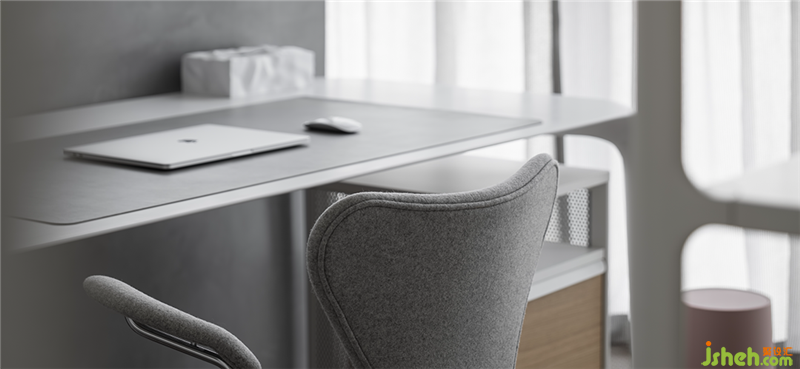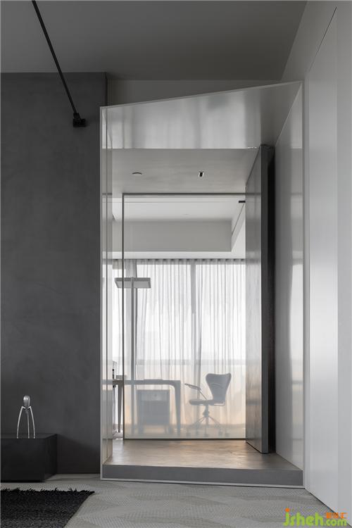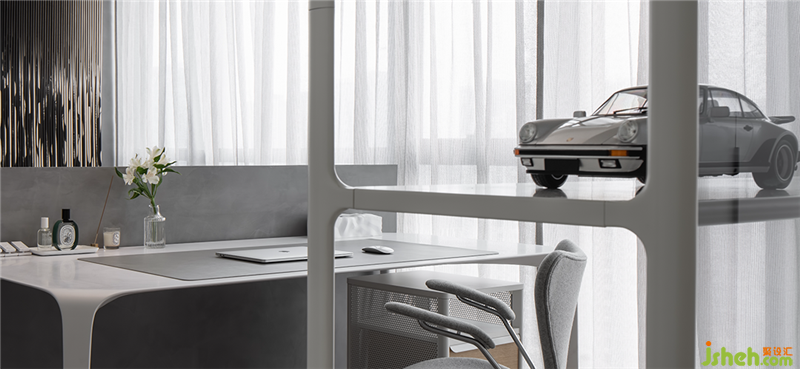 邁步進(jìn)入臥室,一側(cè)為家庭辦公區(qū),在Pandomo和石材鋪就的淺灰底色中,金屬、鏡面及皮革等材質(zhì)交織碰撞,帶來平衡的美感。