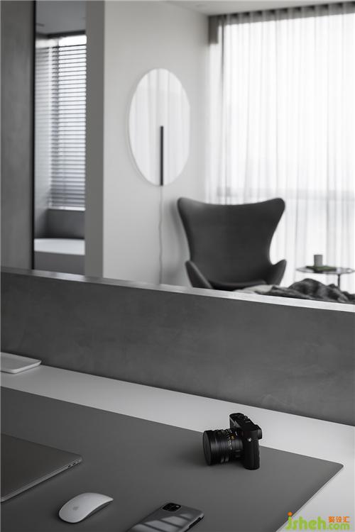 混凝土體塊充當(dāng)床頭背板,懸浮于工作與休息空間之中,在低飽和度灰調(diào)的鋪敘下,北京室內(nèi)設(shè)計(jì)師帶來了微妙而柔和的空間過渡。