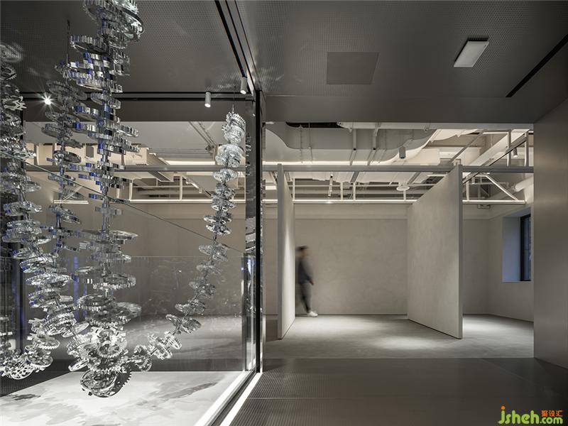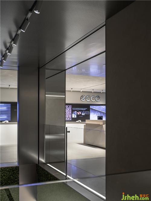 多功能區(qū)域中設置了可移動的墻,可以根據(jù)需要自行調節(jié),空間底色選擇了灰色質地,上海店鋪裝修設計簡練純粹的線條和留白平衡了金屬光澤的鋒利,更顯科技機能之美。