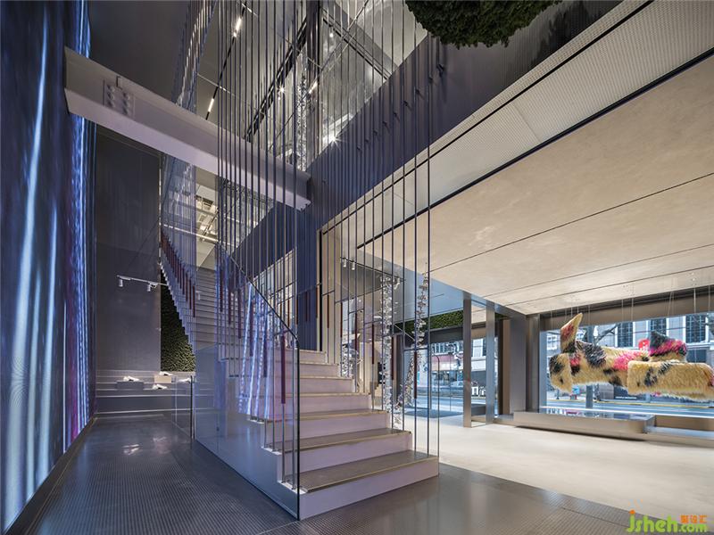 巨大的屏幕由一樓延伸至二樓,熒屏變換色彩,充滿生機的青綠預示著在全新履途上,品牌正探索充滿未知的能量與生命力,為消費者打造夢幻的體驗氛圍。
