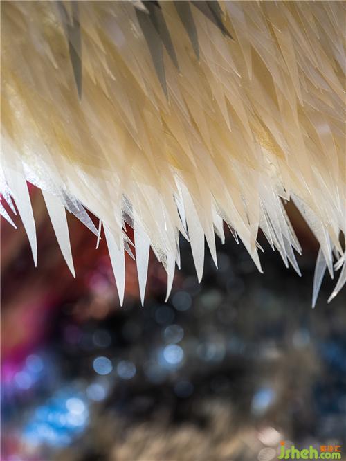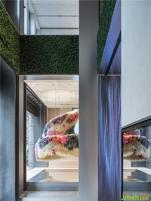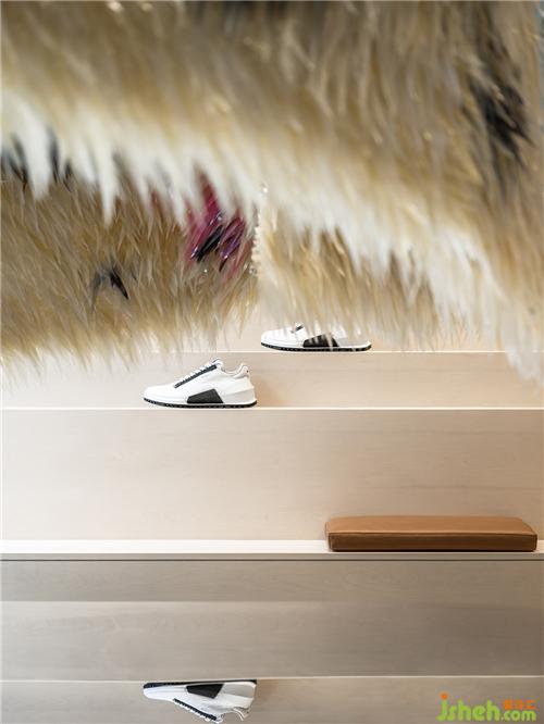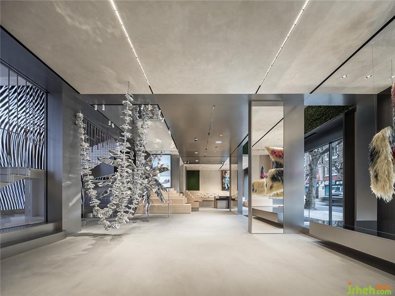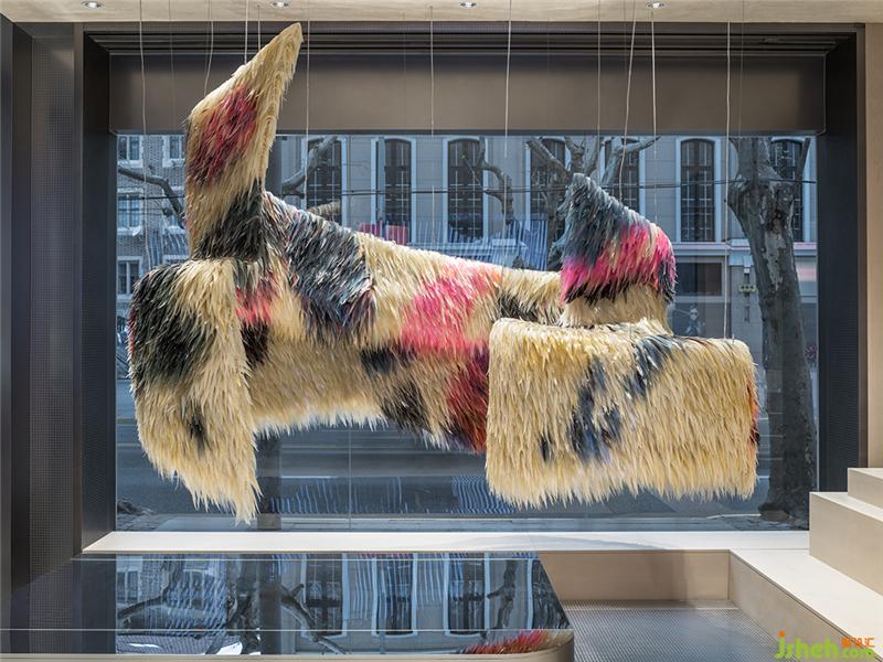 表面似羽毛的大型藝術(shù)裝置,運(yùn)用180平米透明皮革,挑起觀者對(duì)皮革原有的感官認(rèn)知,通過材料關(guān)系與空間形式的層層矛盾感,上海店鋪裝修設(shè)計(jì)建立頗具戲劇性的商業(yè)空間體驗(yàn)。