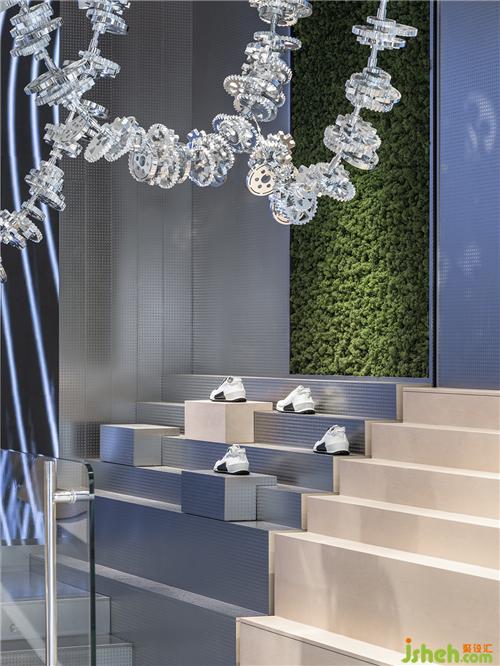 對比傳統(tǒng)的零售空間,黨明希望通過自由的動線、交互的形式,給予消費者更近距離的開放體驗。展示屏通過下方端口達(dá)到交互效果,上海店鋪裝修設(shè)計線上的鞋履試穿效果展示,用高科技簡化了選擇的繁瑣,增添互動趣味。
