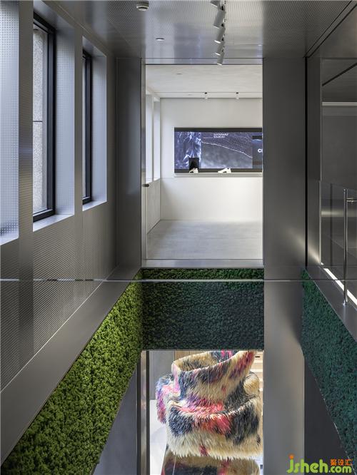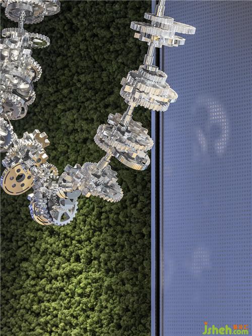 金屬與綠植在室內(nèi)自由地反射光線,大小不一的齒輪跳躍在空中,仿若琴弦上碎裂的音符,以柔和的方式展現(xiàn)科技與工業(yè)的氛圍。